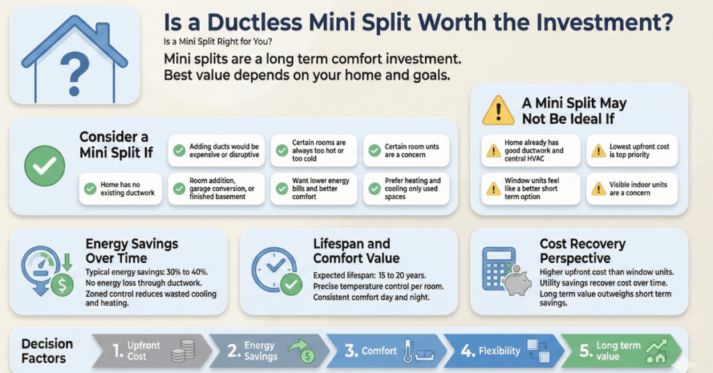 When you factor in energy savings of 30% to 40%, a lifespan of 15 to 20 years, and the comfort of precise temperature control, most homeowners find that mini splits deliver excellent value over time. The higher upfront investment compared to window units or portable ACs is typically recovered within a few years through lower utility bills.
